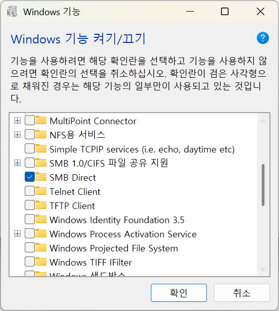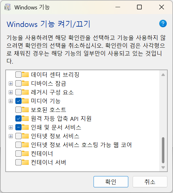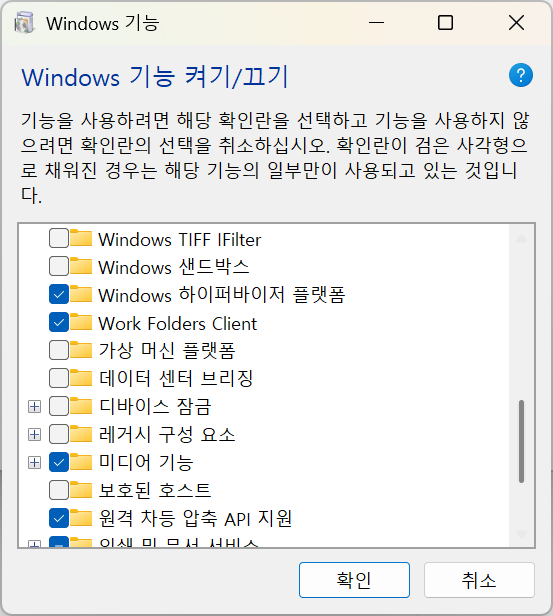 window11 25h2 윈도우 기능 켜기/끄기 기본값 사진으로 올려주실분