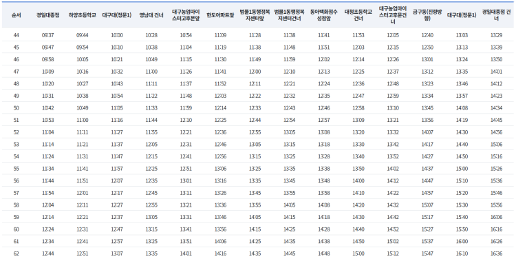 대구 894번 버스는 아래 이미지처럼 약 11분 간격으로 계속 운행되고 있으나(공식 시간표로, 분량이 많아 언급한 시간대만 표기), 과거 시간표에는 간혹 누락되거나 하는 시간이 있을 수 있어 부정확한 부분이 있습니다.